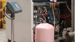 通過電子秤準確補充液態制冷劑量;充注時請注意制冷劑瓶的方向。